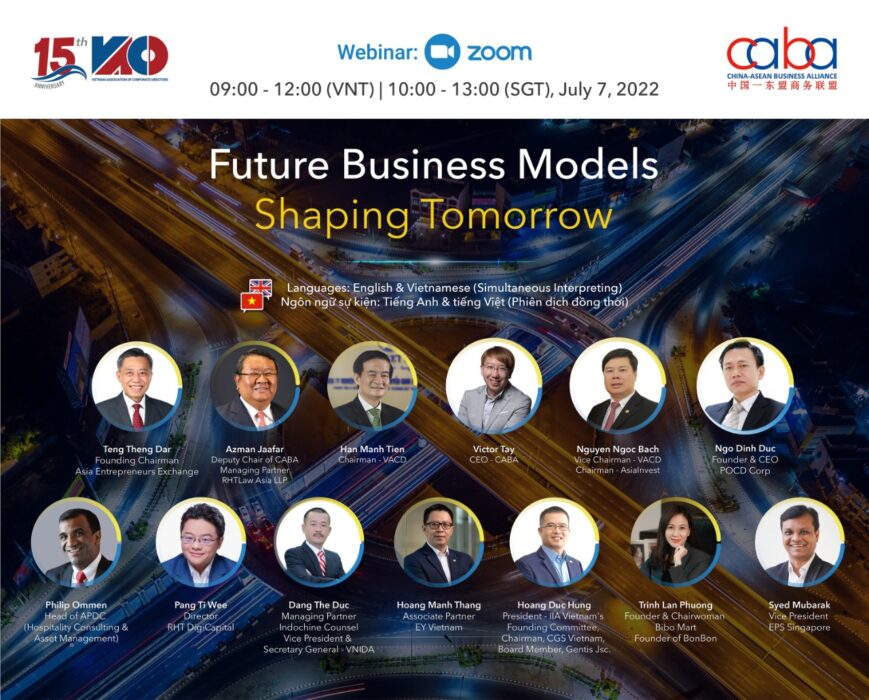 The China-ASEAN Business Alliance (CABA) and ONERHT collaborated with the Vietnam Association of Corporate Directors (VACD) to organise the webinar on “Future Business Models: Shaping Tomorrow” for Vietnam on 7 July 2022. The event is also part of VACD’s series of activities to celebrate its 15th anniversary.